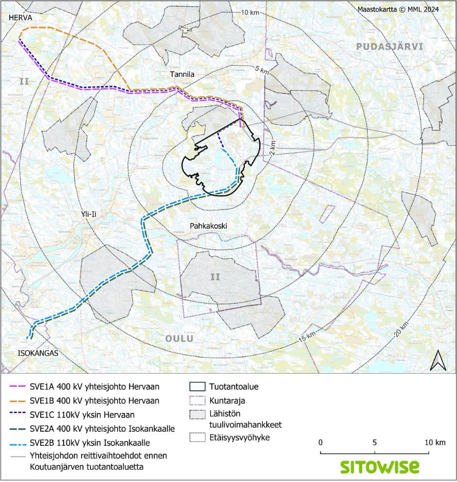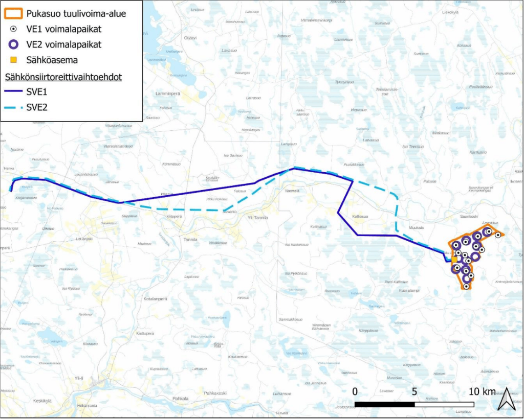 Sähkönsiirto suunnitellaan 400 kV:n ilmajohtona Yli-Iin kunnassa sijaitsevalle Fingridin Hervan sähköasemalle, liittyen osaksi Pukasuon hankkeen sähkönsiirtoreittiä. Reitit ovat alustavia ja tarkentuvat YVA-menettelyn aikana.