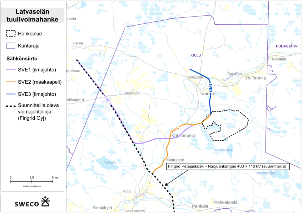 Sähkönsiirto suunnitellaan toteutettavaksi 400 kV voimajohdolla Fingridin Hervan sähköasemalle Yli-Iihin. Reiteistä on kaksi vaihtoehtoa: 45,5 km (SVE1) tai 43,7 km (SVE2), jotka kulkisivat Oulun Yli-Iin alueen kautta Iihin ja liittyisivät osaksi Windan Kuikkasuon hankkeen sähkösiirtoa.