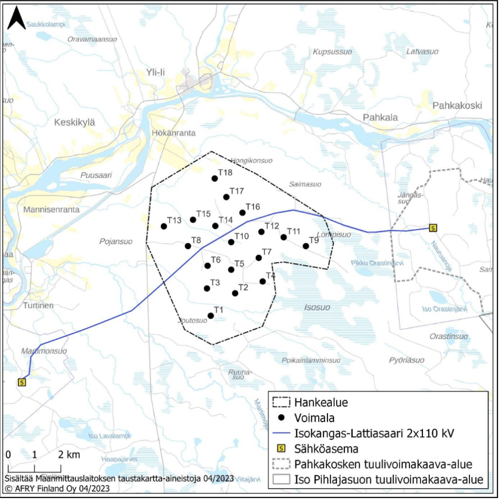 Sähkönsiirto pyritään toteuttamaan yhteisellä 400 kilovoltin voimajohdolla yhdessä lähialueen muiden hankkeiden (Puka-aho–Kaartosuo ja Koutuanjärvi) kanssa. Mikäli nämä eivät toteudu, sähkönsiirto järjestetään erillisellä 110 kV voimajohdolla Hervan sähköasemalle Iihin. Ympäristövaikutusten arvioinnissa (YVA) tarkastellaan useita eri linjausvaihtoehtoja.